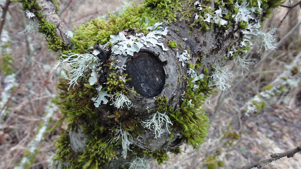 Normally, I don't get much chance to see the lichens and mosses that grow on them.  But without all those leaves in the way, matters become simpler: